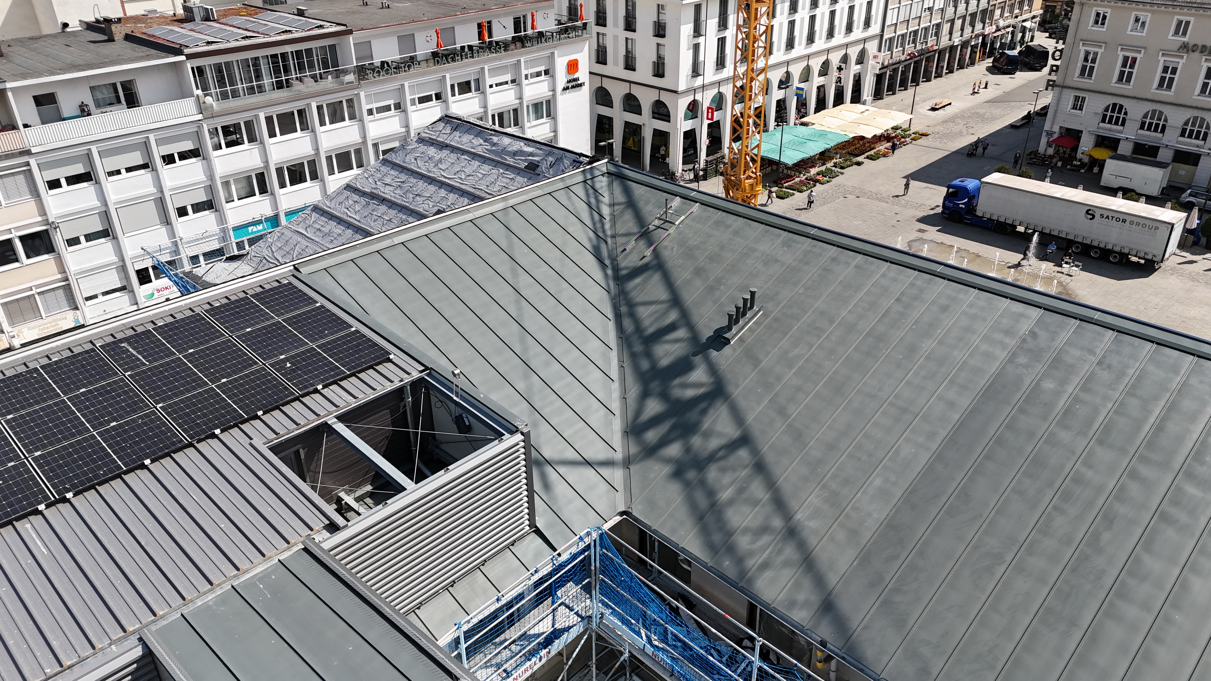Bei der denkmalgerechten Sanierung des Caféhauses Karlsruhe wurde das Dach umfassend erneuert. Neben einer Eindeckung in Stehfalztechnik entstand auch eine neue Dachgaube sowie ein Dachbereich mit Trapezblechdeckung.
