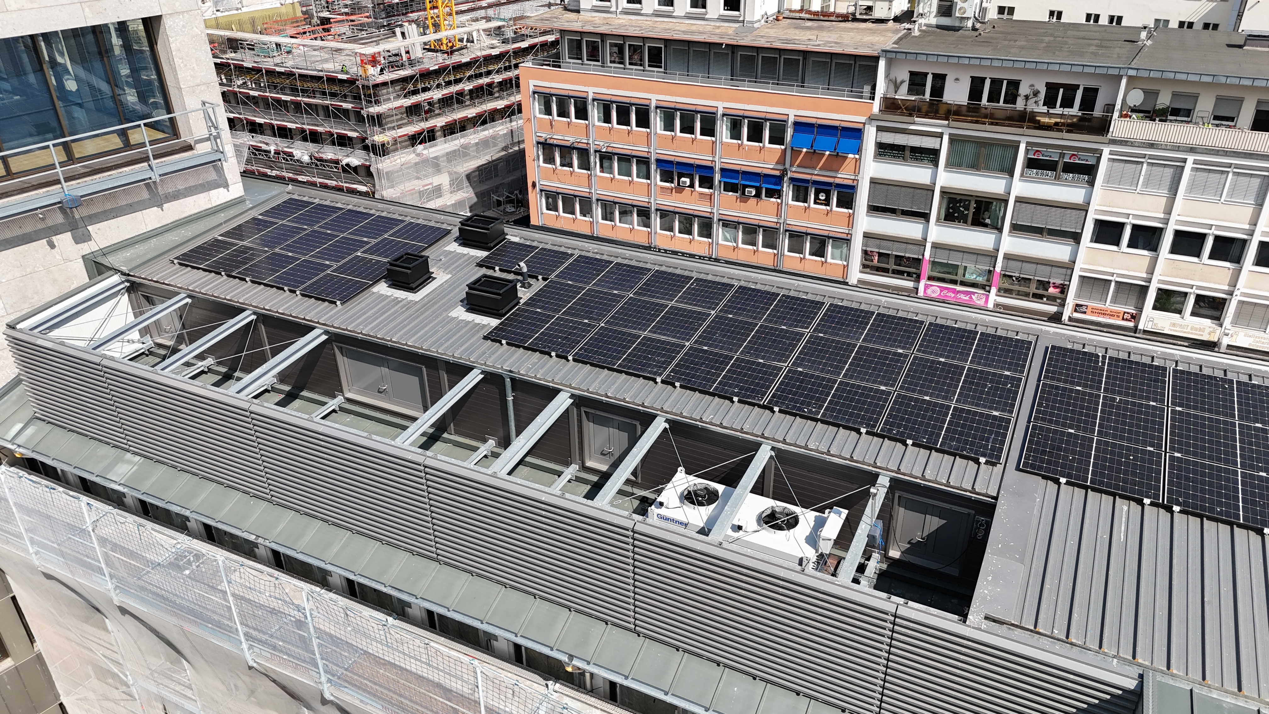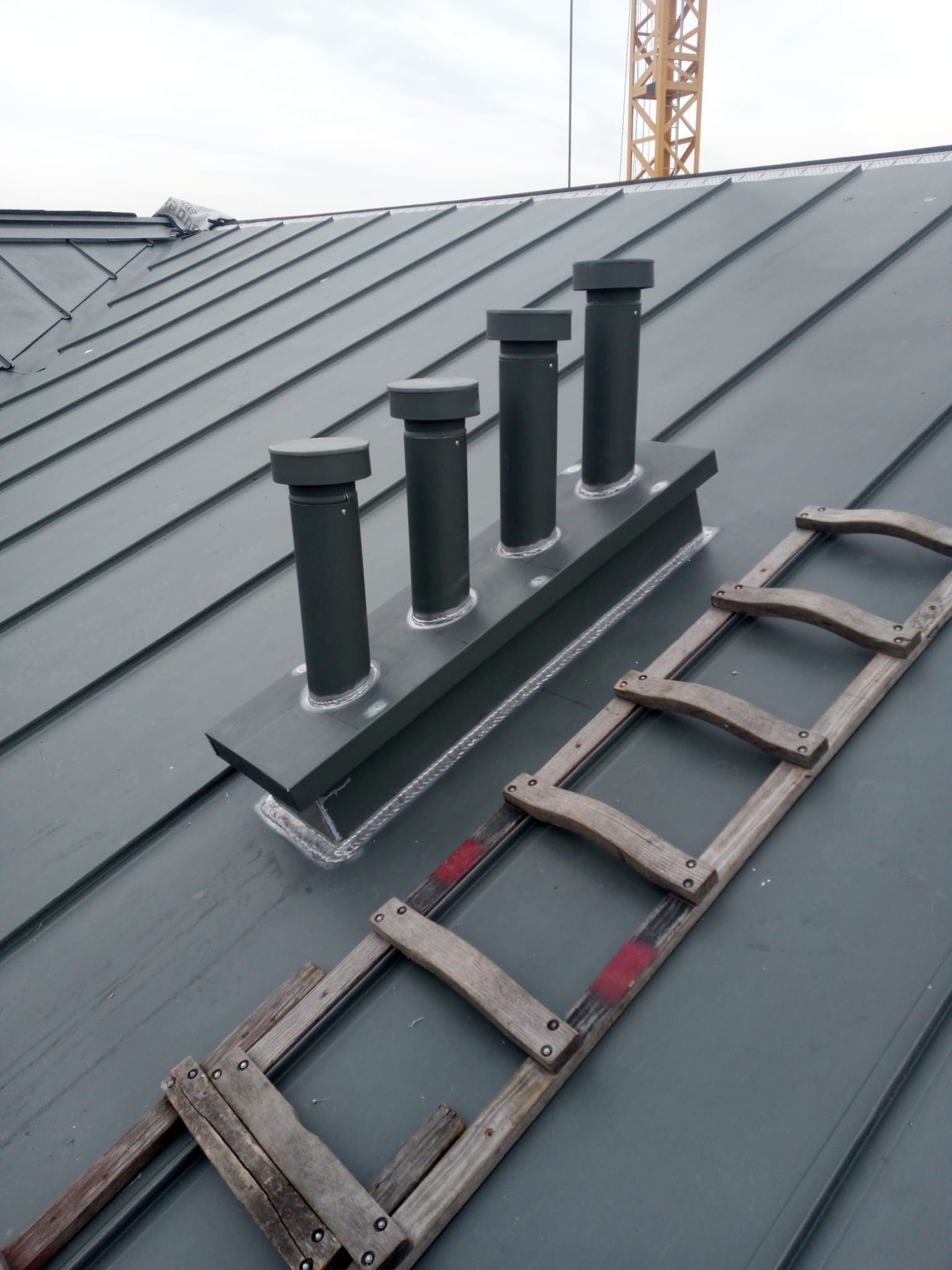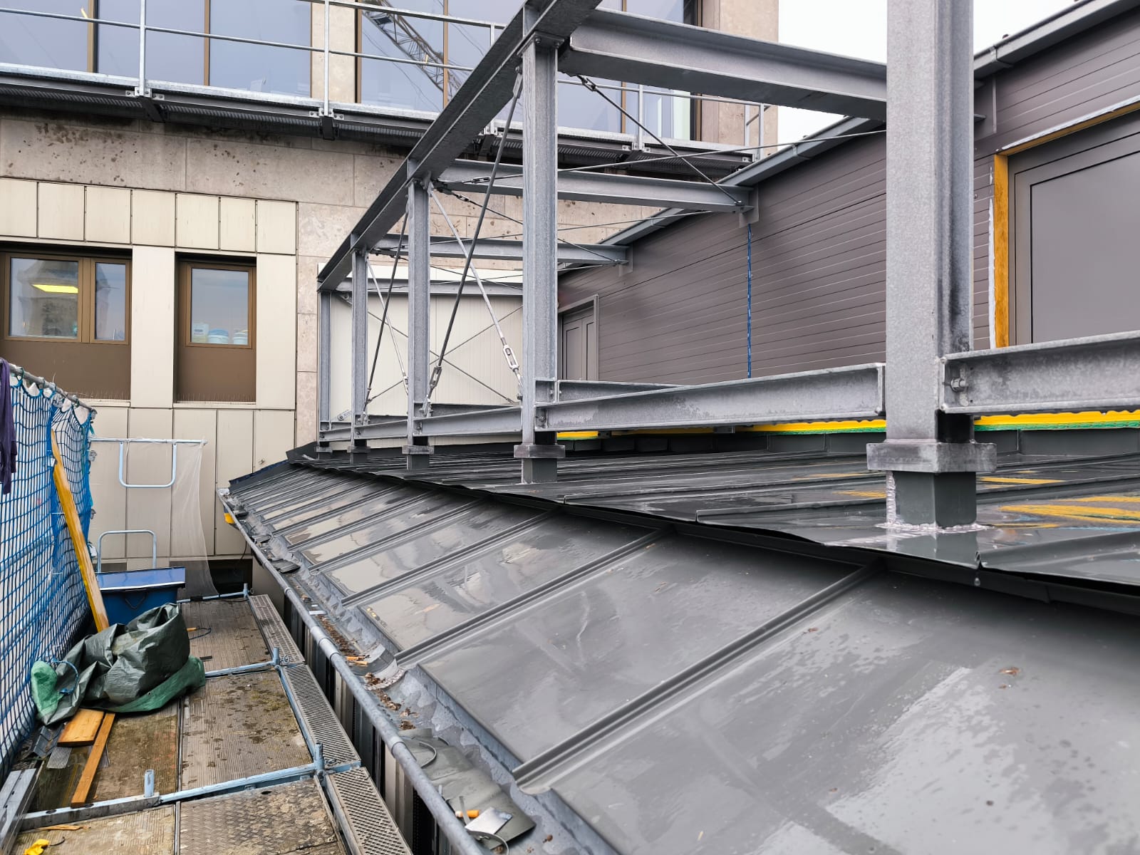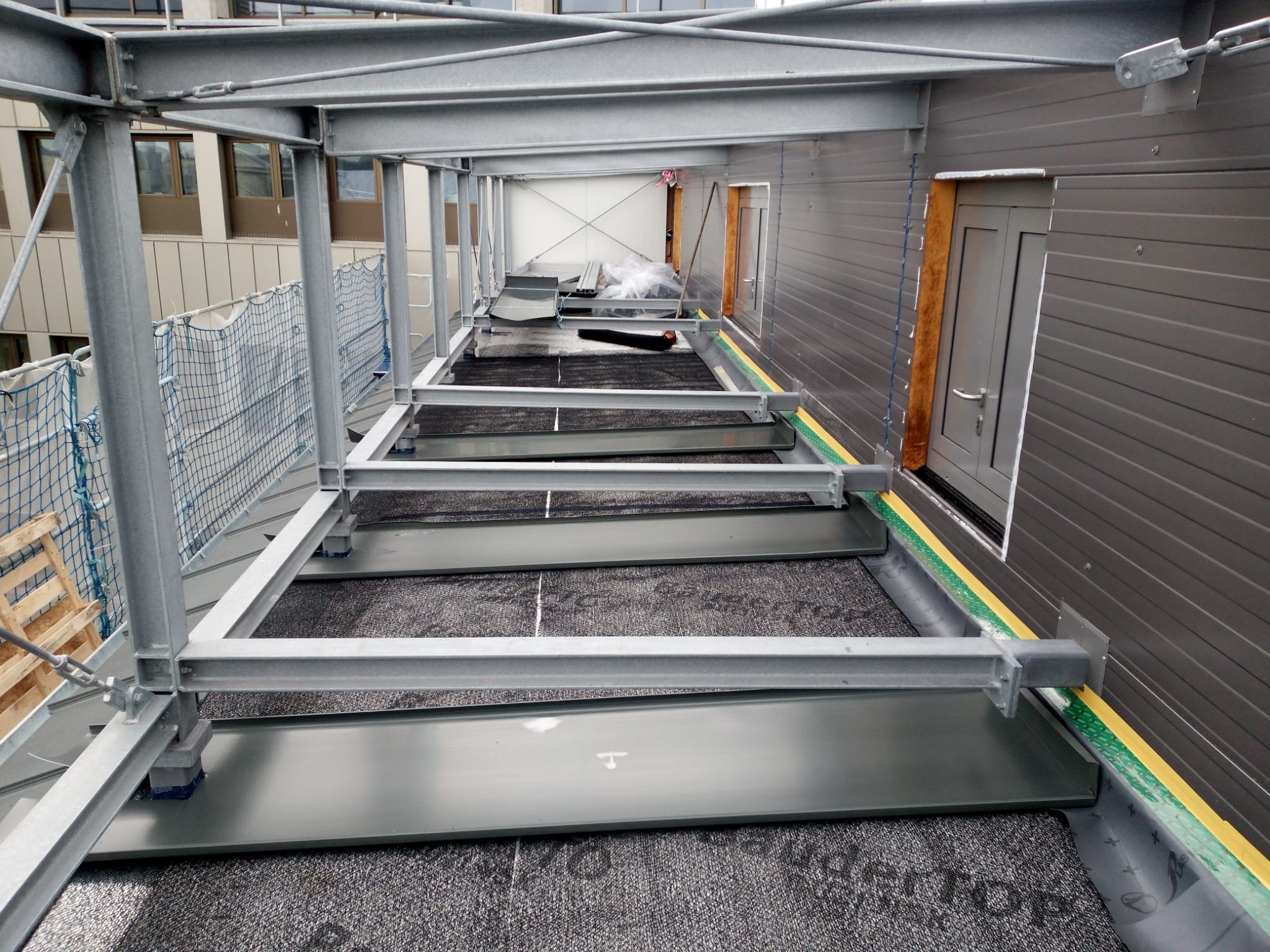 Im Bereich des Techniksturms wurde das Dachgefälle mit einem speziellen Halter angepasst. Dadurch können Wartungsarbeiten an den technischen Anlagen sicher durchgeführt werden, während gleichzeitig ein zuverlässiger Anschluss an das darunterliegende Dach gewährleistet ist.